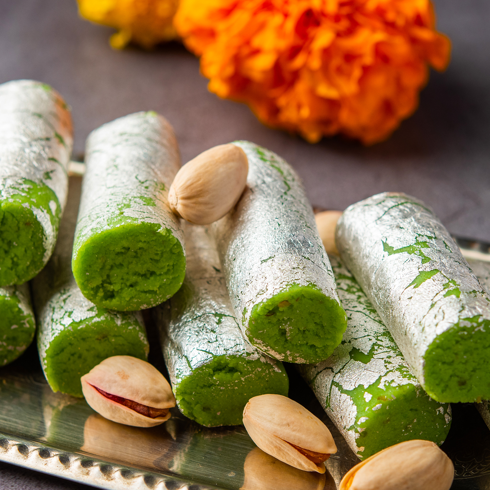 The making process of our Kaju Pista Roll begins by grinding premium cashews and pistachios into a fine paste. This paste is then mixed with a measured amount of sugar syrup, enhancing its sweetness and malleability. The dough is carefully kneaded to achieve a smooth and pliable texture. The prepared dough is then rolled out into thin sheets, and a layer of the cashew and pistachio mixture is spread evenly. The sheet is tightly rolled to form a cylindrical shape. Finally, the rolls are adorned with a sprinkling of pistachio flakes, adding a touch of elegance and crunch. Each bite of our Kaju Pista Roll offers a rich, creamy, and nutty experience that is truly indulgent. Experience the perfection of our handcrafted Kaju Pista Roll, exclusively at Shree Laxmi Sweets.