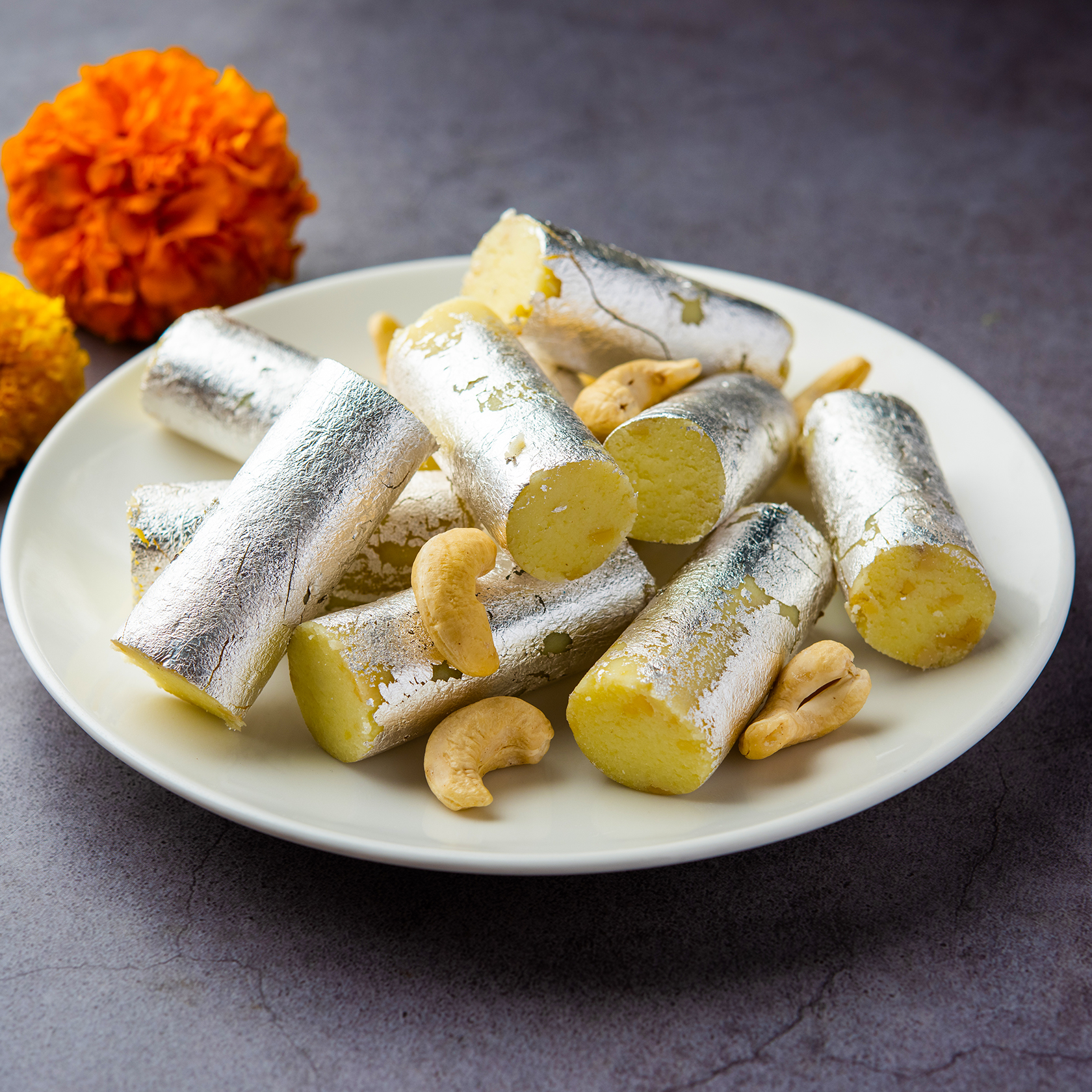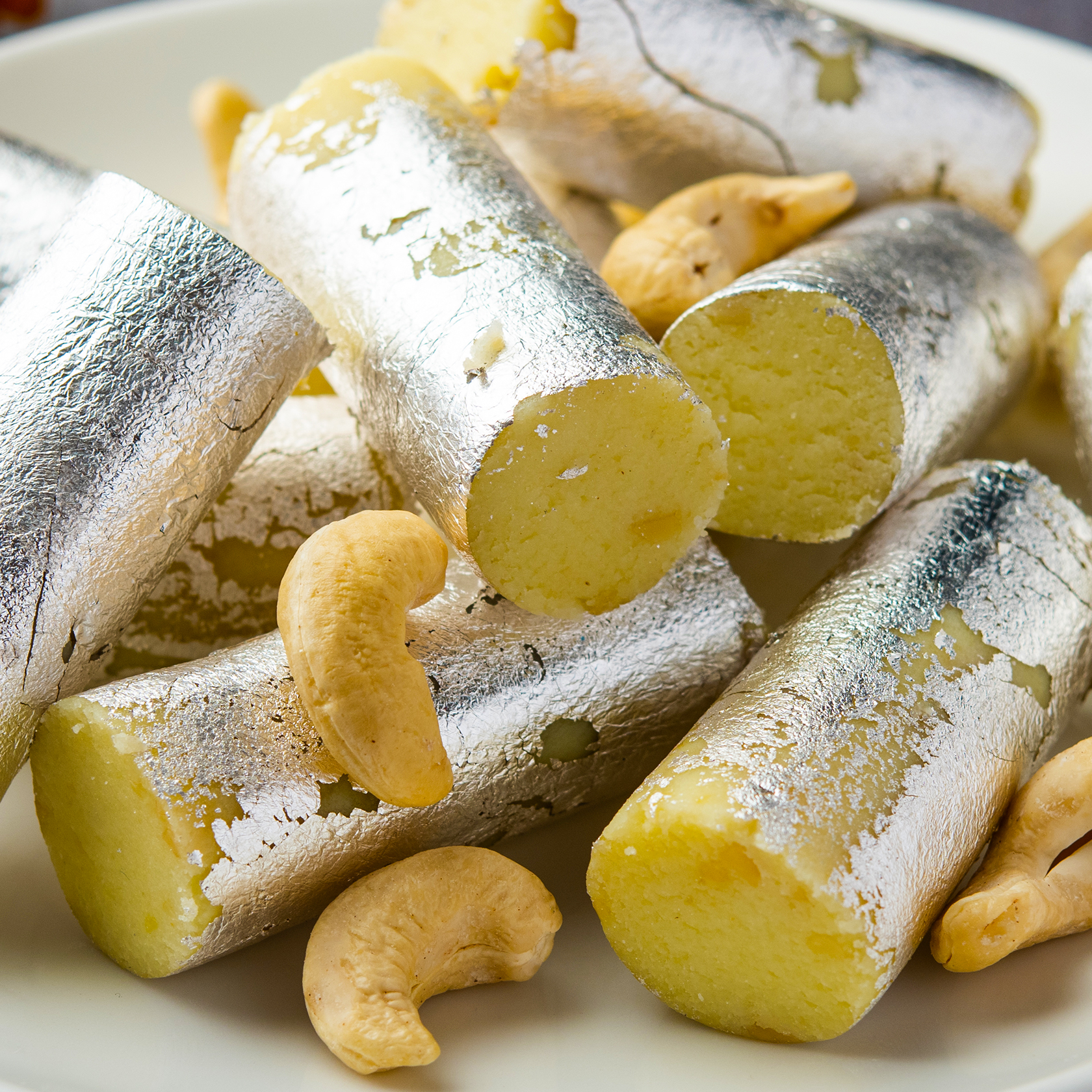 The Kaju Roll is a true testament to the skill and expertise of our artisans. Each roll is meticulously shaped by hand, ensuring a consistent and elegant appearance. The final touch is a delicate garnish of silver leaf, adding a touch of sophistication to this already exquisite creation.