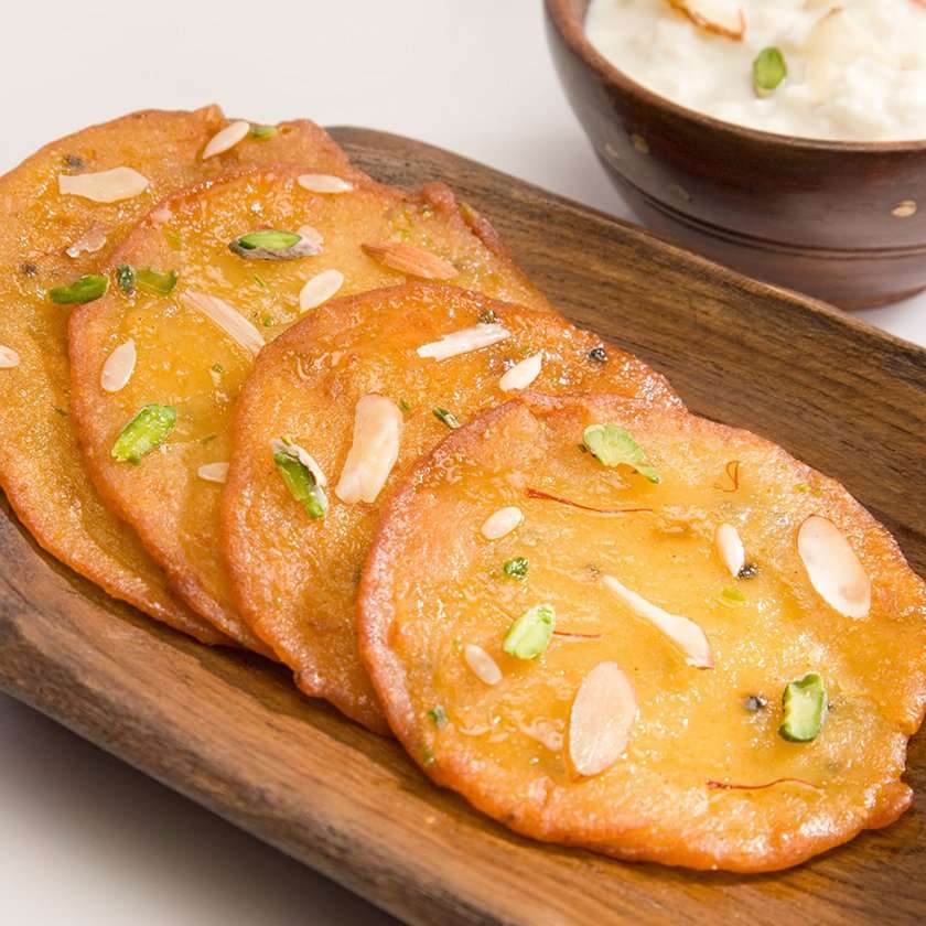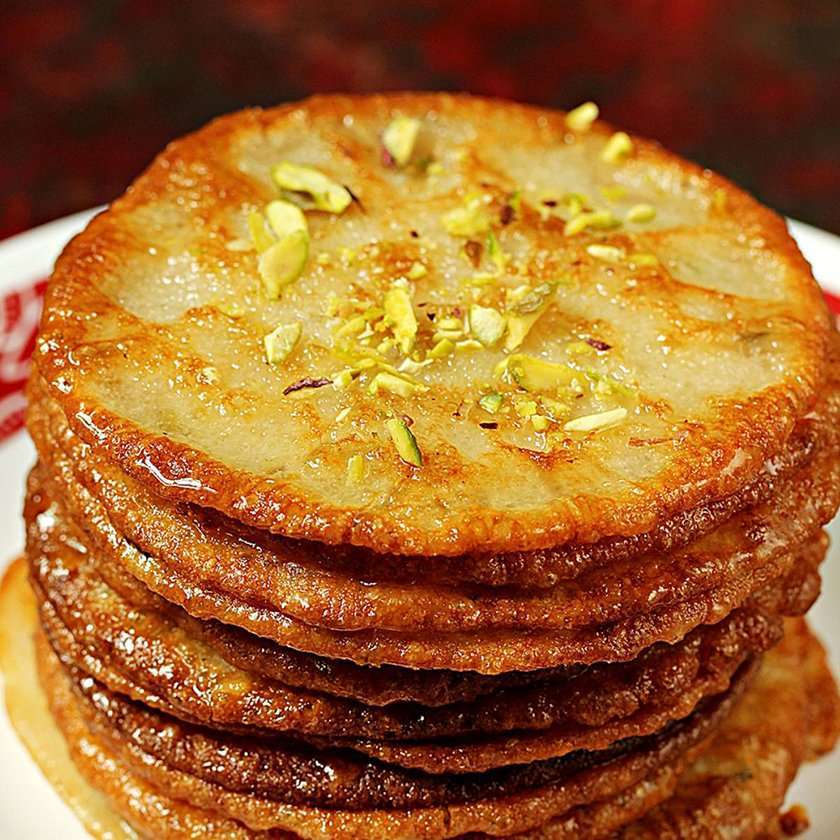 At Shree Laxmi Sweets, we present the exquisite “Malpua,” a beloved Indian dessert. Our Malpuas are a heavenly combination of deep-fried pancakes soaked in a fragrant sugar syrup. The journey begins by preparing a batter with flour, milk, and a hint of cardamom for an aromatic touch. The batter is then ladled into hot ghee, forming golden pancakes that turn crispy on the edges and irresistibly soft at the center. Once cooked to perfection, these delicate pancakes are immersed in a luscious sugar syrup infused with saffron and rose water, allowing them to absorb the sweet goodness. The result is a divine dessert that melts in your mouth, offering a symphony of flavors with every bite. Indulge in the decadence of our authentic Malpua, handcrafted with love and tradition at Shree Laxmi Sweets.