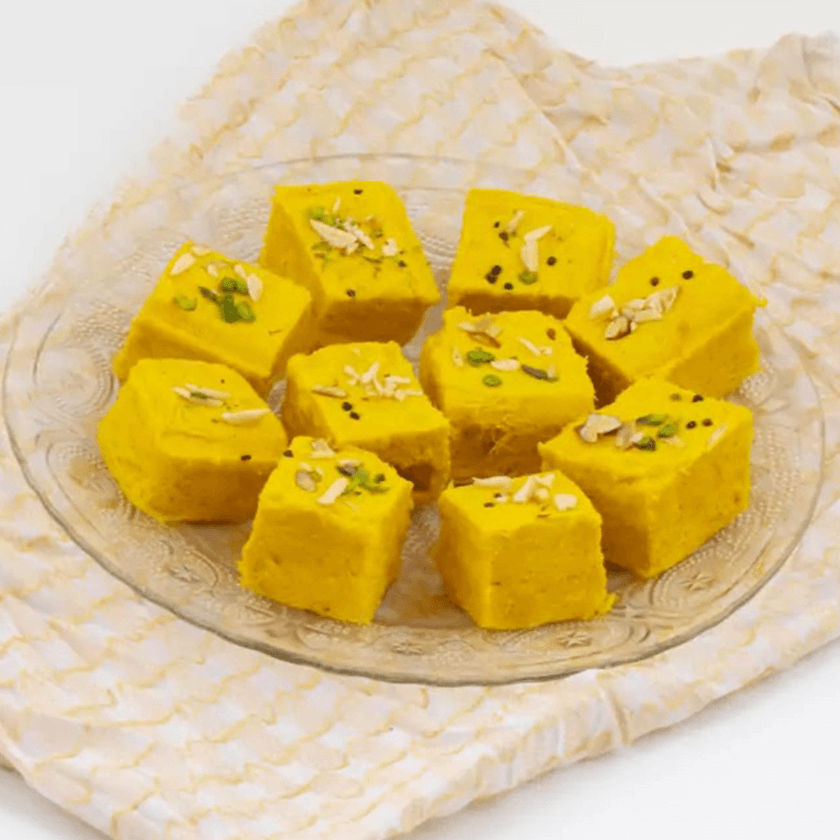 Introducing the irresistible “Sohan Papdi (Desi Ghee)” at Shree Laxmi Sweets! Made with utmost care, our Sohan Papdi is a delightful blend of rich desi ghee, sugar, and roasted gram flour. The making process involves cooking the mixture to perfection, shaping it into thin, flaky layers, and garnishing it with nuts. Experience the melt-in-your-mouth goodness of our handcrafted Sohan Papdi, exclusively at Shree Laxmi Sweets.